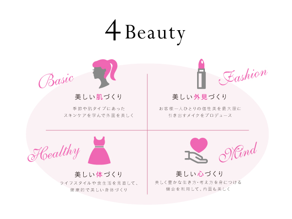 GISELEグループ共通のコンセプトである5つの美容"Crystal Beauty"に基づき、適正な価格と高い技術力で、スキンケアからライフスタイルまでトータルでお客様の“beauty”をサポートします